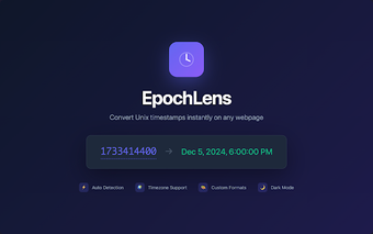 EpochLens هو إضافة مجانية لمتصفح Chrome مصممة لتبسيط تحويل طوابع زمن Unix إلى تنسيقات قابلة للقراءة البشرية. يقوم بالكشف تلقائيًا عن الطوابع الزمنية على أي صفحة ويب، ويقدم خيارات عرض متعددة مثل تلميحات عند التحويم أو شارات داخل النص. يمكن للمستخدمين تخصيص تنسيقات التاريخ وتكوين المناطق الزمنية لإجراء مقارنات سهلة، مما يجعله أداة قيمة للمطورين ومهندسي DevOps ومحللي البيانات الذين يعملون بشكل متكرر مع الطوابع الزمنية.